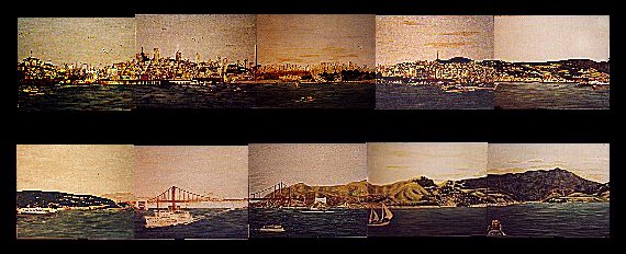 Here is a small reproduction of Chase's panorama of the San Francisco Bay as seen from Alcatraz. Click on the section you wish to view up close. Some of the large reproductions are imagemaps which allow you to look at special details mentioned in the text. To see an enlarged version of the whole panorama (120K), click here. ![]() | Click here to read a biography of Chase Return to the Gallery Return to the Main Index |