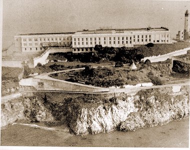 This view of the Cell House from the South is distinct because it includes the route taken by Arthur Barker and his companions in their 1939 break from D-Block. The escapees made their way down from D-Block (center), down the road and past the Road Tower (left, just beneath the corner of the recreation yard), and down a steep escarpment to the rocky shore known now as "Barker Beach".
